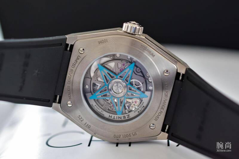 通过蓝宝石水晶透底表背可以观察到其内所搭载的Elite 670型自动上链机芯。它的振动频率为28800 vph,可提供48小时的动力储备,摆动锤为Arctic Petrol蓝色星型外观。正如之前所提到的那样,在表底盖上能够看到"Defy for Range Rover"的雕刻字样,限量编号位于其对侧。