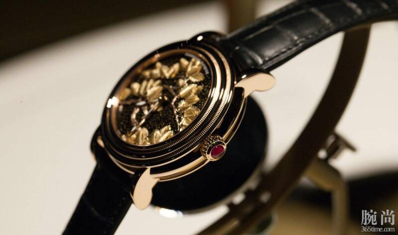 松树主金雕而成,雕刻师喷刷了生锈般的颜色,目的是使树木呈现出一种自然侵蚀的状态,显得更为生活。表冠上镶嵌一枚凸圆红宝石。此表搭配哈瓦那雪茄色爱马仕鳄鱼皮表带。