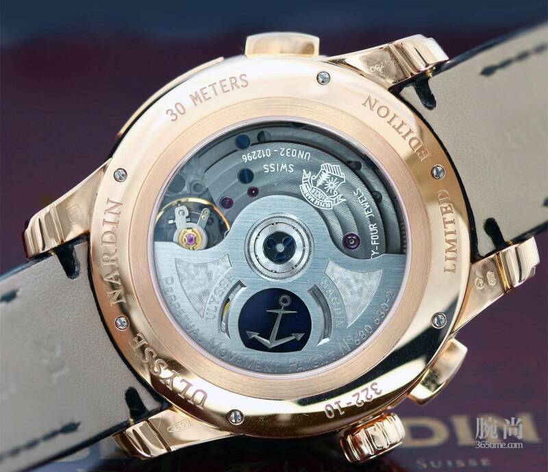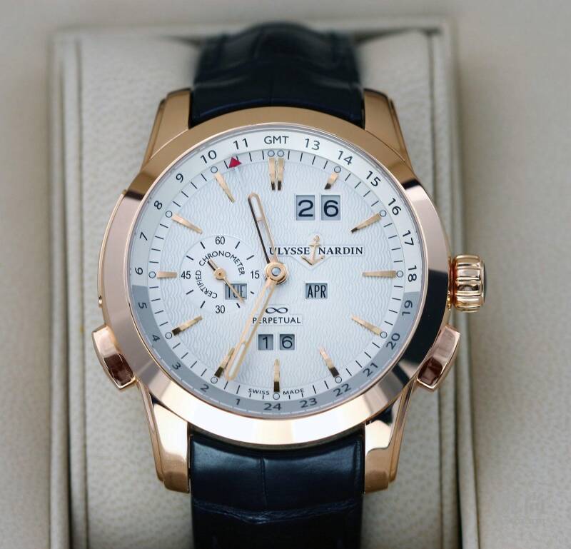雅典独创可逆调万年历腕表322-10腕表搭载的UN-32机芯设有第二地时间指示,轻按位于 4点钟和8点钟位置的(+)(-)键,时针可以迅速前后调校至另一时区。当时针跨越国际日期变更线时,年份、月份、双窗口大日期及星期四个窗口皆会自动地同步前后调校,达至复杂机械腕表的最高境界;而红色GMT箭头指针可指示原居地或第二地时间。