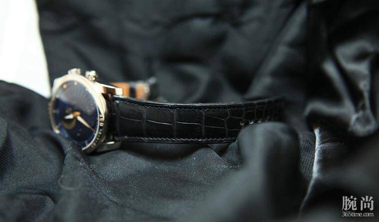 帕玛强尼Grande Lune大月相腕表的大月相相当于霸占了整个表盘。在简单的时分秒三根指针下,是一个超大的月相显示窗口,这个窗口与表盘形成了一个同心圆,就像是整个月亮在盘面上转动。随着时间的流逝,月相盘也在缓缓转动,并可以通过镂空处理的上层盘面上的数字来读取月龄。Grande Lune大月相腕表的两层盘面均采用色调较暗的蓝色,月相以手工锤炼的金质打造,观感非常夺目。