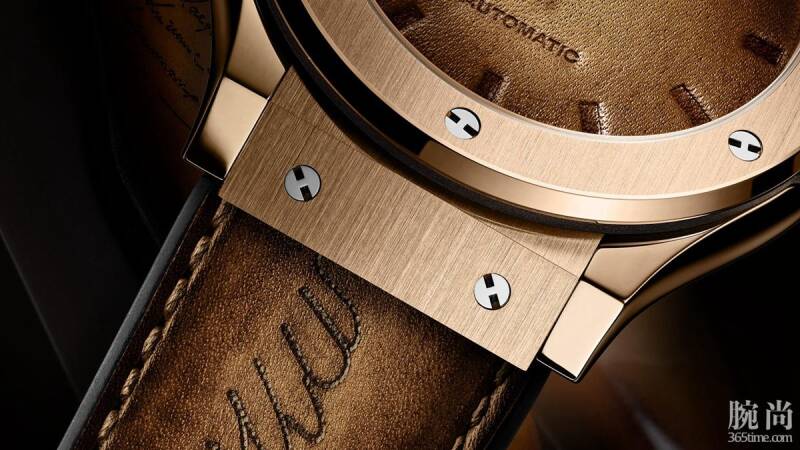 全新宇舶经典融合系列伯尔鲁帝计时限量腕表采用宇舶特有的王金Scritto材质,其表壳色泽极为柔和,同样采用拉丝抛光工艺处理,搭配着烟草棕色皮革(Berluti的标志性色彩)盘面以及一条皮革表带。盘面布局上采用子表盘左右对称式设计,3点位的是小秒盘,9点位的则是30分钟计时盘,没有日期显示功能。该表款内部搭载着的是Cal.HUB1143型自动上链机芯,振动频率为4Hz,可提供42小时的动力储备。
