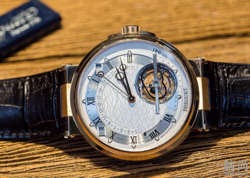 当然除了玄妙的时间等式功能之外,这款宝玑航海系列全新5887超卓复杂功能腕表还拥有位列三大复杂功能之一的万年历功能。表盘的10点至11点位置设有星期显示视窗,1点至2点位置显示月份和闰年历。针尖饰有船锚图案的逆跳指针,沿刻度环内侧9点至3点之间的扇面转动,指示日期。表盘的信息显示经过精心布局,优美简洁、一目了然。
