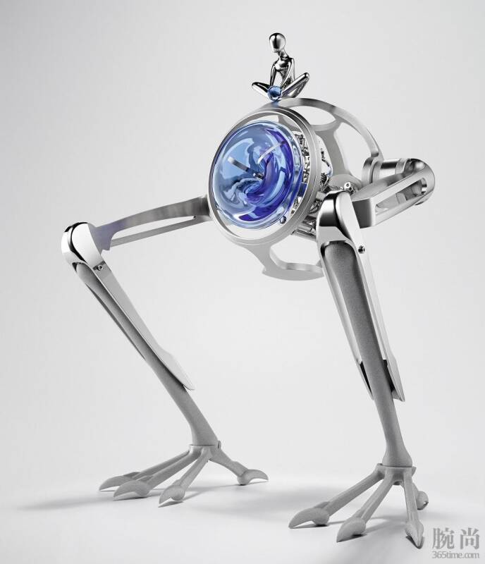 这只座钟高30.8厘米,重达2公斤,由201个精钢、青铜和镀钯黄铜零件组成。浅蓝色表盘为穆拉诺手工吹制玻璃,从中央伸出两枚弯曲的指针。小男孩 Tom 则安静地坐在表壳上方,手持一枚蓝色玻璃球,沉浸于自己的内心世界之中。