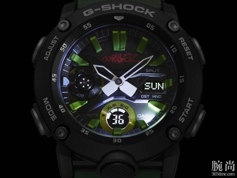 而GA-2000GZ则以Gorillaz首张同名专辑封面的绿色迷彩为灵感,採黑色表壳与面盘搭配印满绿色迷彩的表带,并在表盘刻度、表眼等细节以绿色点缀,并且附上以雷射雕刻刻印迷彩线条的全黑可替换表带。GA-2000GZ并搭载碳纤维核心防护构造,具备抗冲击、轻量与耐用等特性,且配备防水两百米、双LED灯、世界时间…等实用功能。