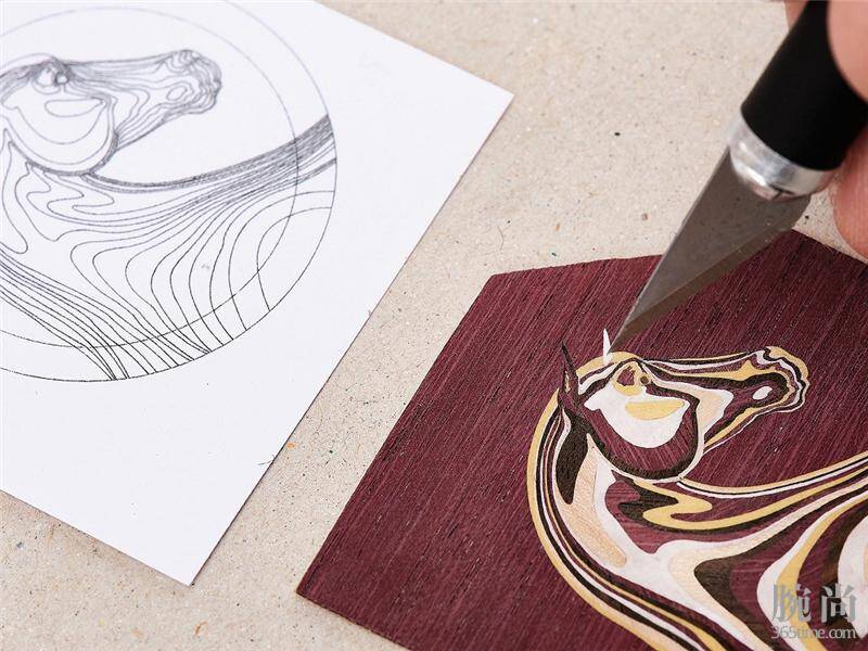 工艺师首先将丝巾花纹缩小至表盘比例,在木片上描绘出相应的曲线轮廓;随后用雕刻刀切割下细小的木片,依次进行打磨和上漆;最后如拼图般将木片无缝嵌合,构成完整的骏马形象,每一枚表盘的制作耗时约为3周。