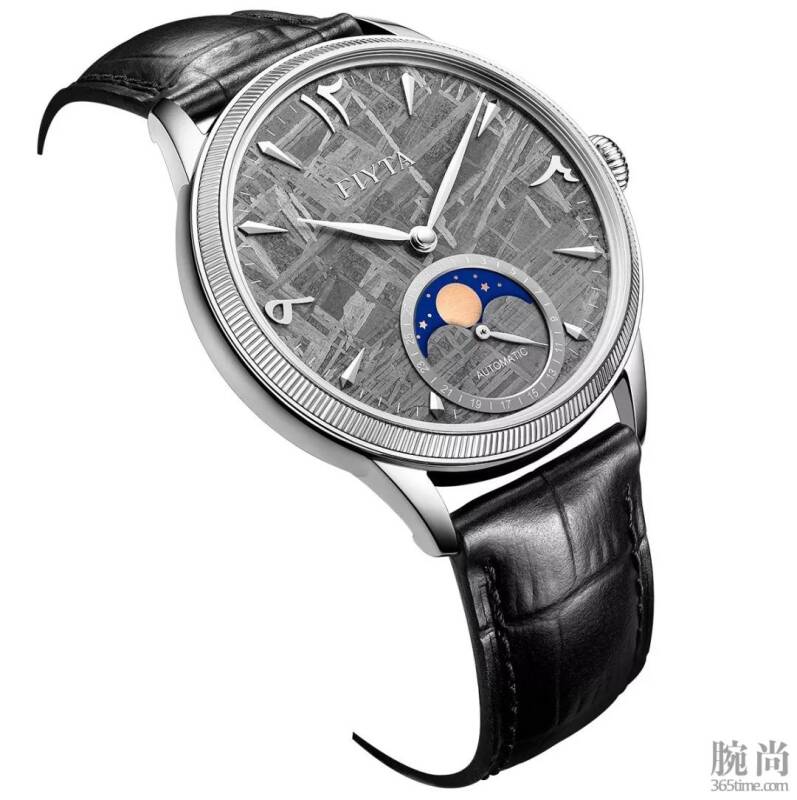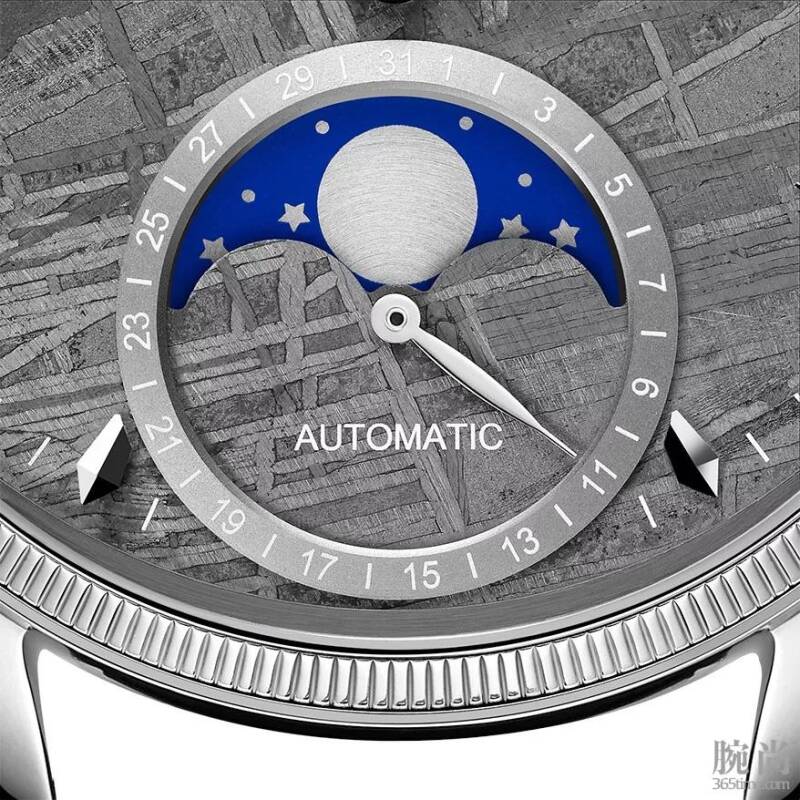 表壳延续了"飞天"腕表的设计,简约雅致,尤其是外圈的硬币坑纹设计,更让腕表多了几分大师级的不凡。表盘6时位一个大尺寸的月相显示格外醒目,最特别的是一枚搭配陨石表盘的款式,更是凸显了月球的唯美以及浩瀚宇宙的神秘。