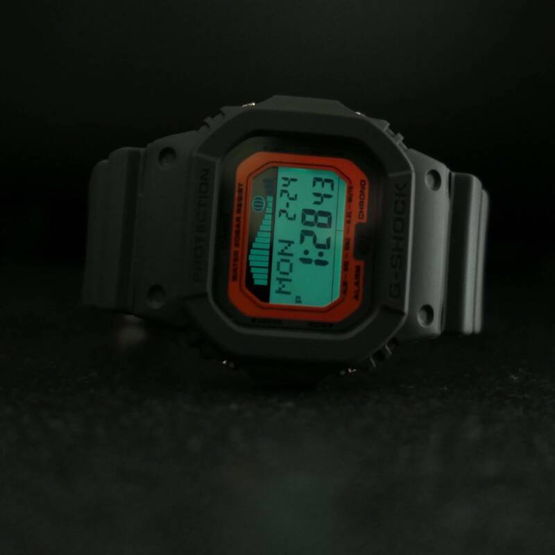 GLX-5600防水200米,并有潮汐和月相图。其他功能包括月龄数据,自动EL背光灯,闪光警报,世界时间,1/100秒表,倒数定时器(最多24小时,具有自动重复功能),3个多功能警报器和1个小睡,大约7年的电池寿命,采用半透明的橙色表壳。