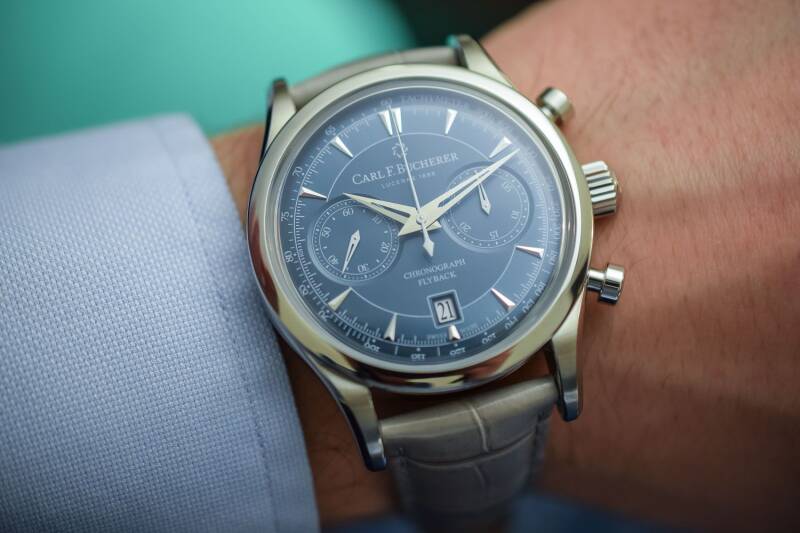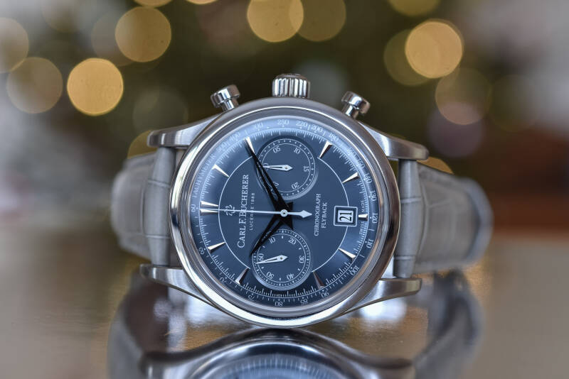 例如,凸轮杠杆机制已被导柱轮模块所取代,这就增强了它的高级感和带来了更讨喜的使用感(按钮按下的感觉更柔和)。飞返机制允许佩戴者通过按压4点位处的按钮来重新开始一轮计时动作,便捷又节能。最后,Valjoux经典的12-9-6布局被替换成了双眼式布局,这样既创造了良好的对称感,也给了子表盘更为充裕的空间。这枚CFB 1970机芯的摆频为4Hz,可提供42小时的动力储备,它在修饰方面使用了包括像是日内瓦条纹、珍珠纹和蓝钢螺丝等元素,其中黑色的导柱轮与其余部分形成了鲜明的对比,尤为显眼。