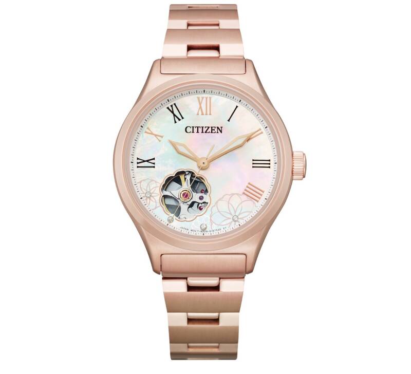 腕表在细节设计上处处流露出巧思与韵致。双色罗马刻度,典雅中亦不乏春日的活泼气息。表盘上镶嵌4颗施华洛世奇水晶,犹如露珠滚落花瓣之上,明澈灵动。透过通透的蓝宝石玻璃表镜,表盘7点位的透视机芯设计匠心独运。伴随着滴答的走时声,机械齿轮有节奏的运转让整朵镂空牡丹"活"了起来,更与周围的牡丹浮雕纹路连成一片,隐约间幽香浮动。腕表搭载的是西铁城自主研发的自动机械机芯,可通过日常手腕的运动为腕表蓄能,时刻提供贴心的陪伴与支持。