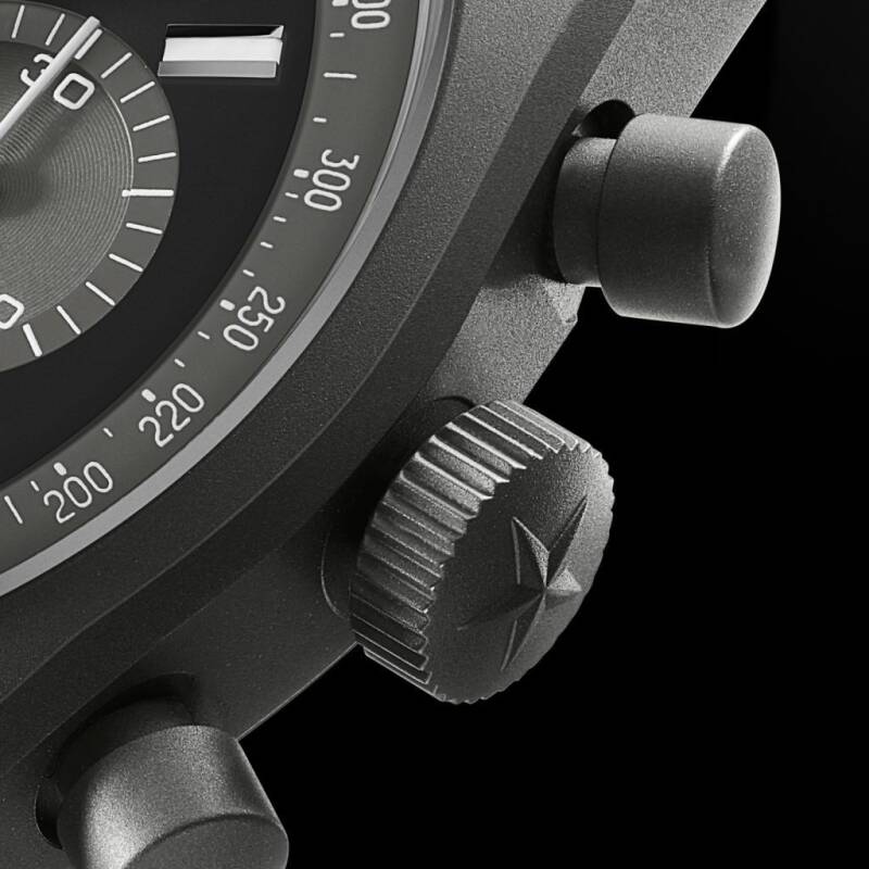此次推出的真力时CHRONOMASTER旗舰系列复刻版"暗影"腕表并没有直接地复刻真力时历史表款的设计,而是另辟蹊径。深受1970年黑色计时码表原型的启发,这款"暗影"腕表采用37毫米直径的表壳,真实再现首款搭载El Primero机芯的A384腕表在外形设计上的非凡魅力。但是,真力时并没有选择传统的以黑色涂层表面处理的精钢材质,而是采用了微喷砂工艺处理的钛金属,这种轻盈并耐用的金属材质经完全哑光的打磨处理后,释放出深灰色光泽。与1970年制作的搭载手动上链计时机芯的原型表不同,此款真力时CHRONOMASTER旗舰系列复刻版"暗影"腕表搭载了深受欢迎且迄今为止最多产的El Primero自动上链计时机芯,并通过背透设计,使机芯一览无余。