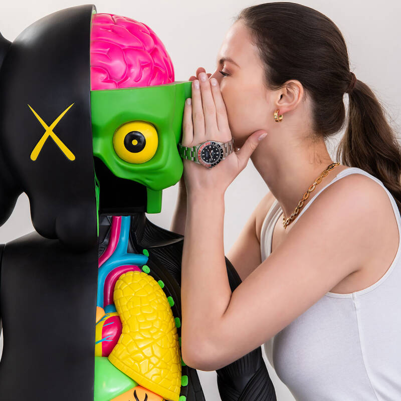 KAWS《四尺解剖同伴(黑色)》,彩绘乙烯基,尺寸128.2 x 57 x 35 cm,共有100版,并附香港超人玩具所发之发票,载明此作之购买日期及直接购自日本MEDICOM TOY。成交价港币750,000(估价400,000 - 600,000)。