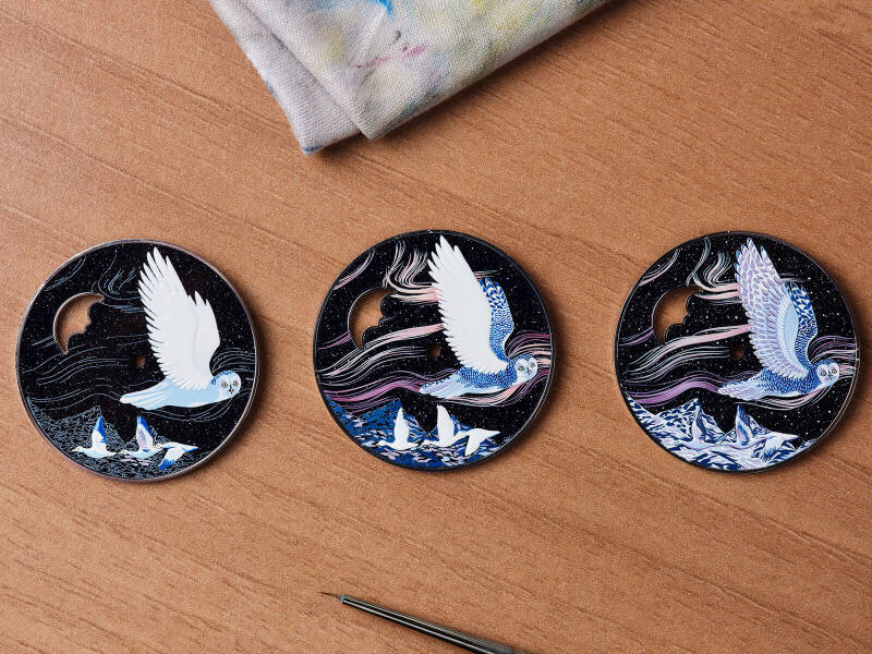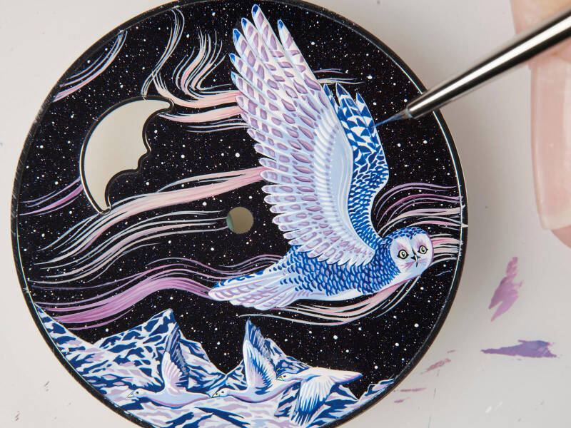 工艺师首先在砂金石表面勾勒出整幅画面的线描轮廓,再置入窑炉中烧制;随后描绘出不同的颜色层次,生动展现雪鸮的羽毛纹路、北极熊的绒毛光影、冰川棱面、海洋波纹等细节,每添加一种颜色,都需要在高温中进行烧制,每一枚表盘的制作耗时超过一周。