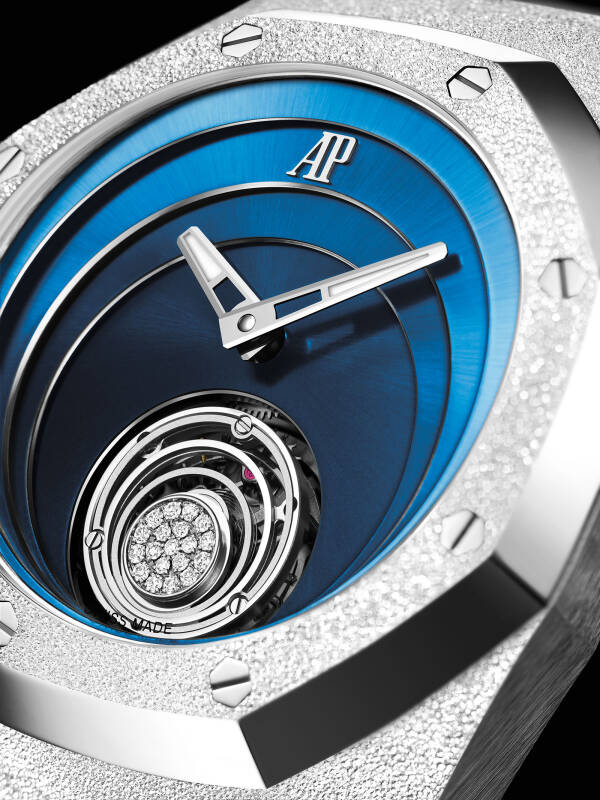 新款手表最不寻常的地方是表盘设计,这是皇家橡树的首创。表盘由金属蓝色制成,带有径向拉丝表面,由四个同心圆组成,向下朝指针方向倾斜。六点钟位置的陀飞轮框架也是类似的,由四个环组成,并以镶有明亮切割钻石的圆圈结束。