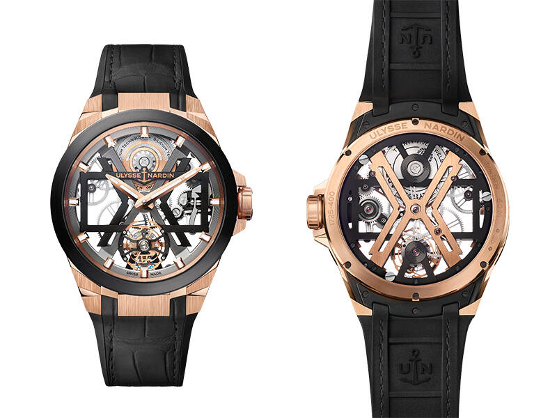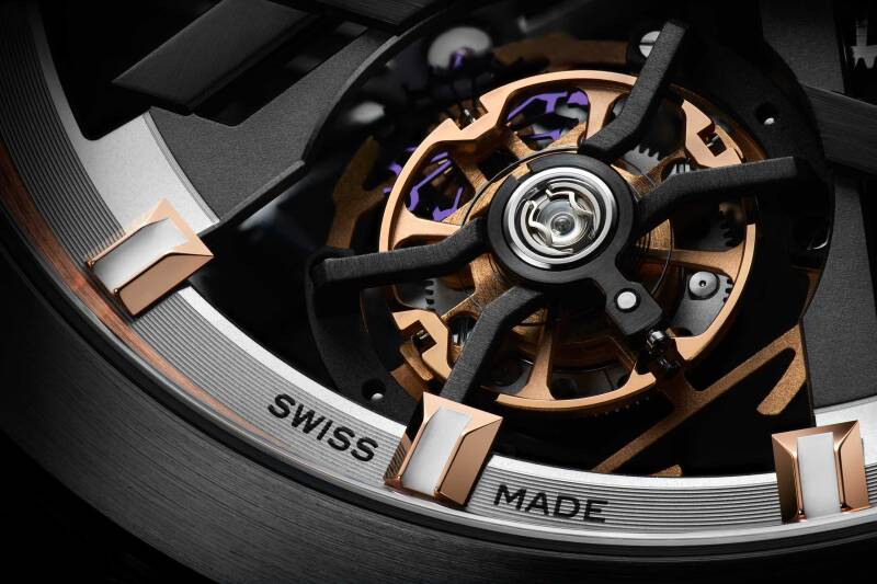 这款腕表采用贵金属材质锻造而成,搭载黑色DLC涂层中壳和纯金表耳、黑色陶瓷表圈、玫瑰金和黑色PVD涂层双色陀飞轮框架、涂覆Superluminova夜光涂层的玫瑰金指针和时标、透明宝石轴眼、黑色"X"框架造型,黑色矩形框架造型。