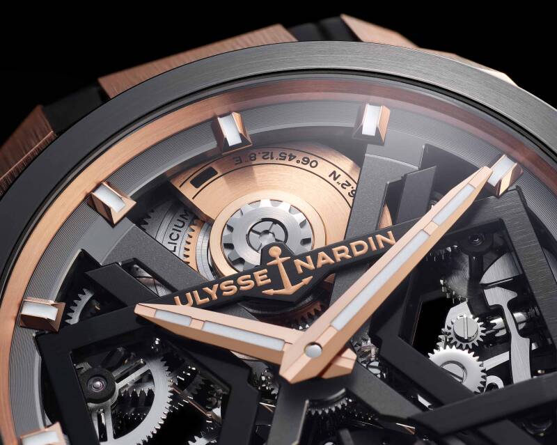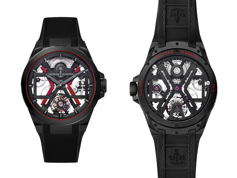 作为这一全新系列的代表之作,黑色Blast镂空陀飞轮腕表的中壳上半部分和表圈采用陶瓷材质,搭载黑色矩形板桥、红色与黑色双"X"框架造型,以及醒目的全新红色摆轮,这也是雅典表首次在腕表中引入彩色摆轮。此外,水晶表镜与表圈的衔接处、宝石轴眼和发条盒上的"Silicium Technology"(硅技术)字样也均为红色。表盘的矩形框上刻有灰色"Ulysse Nardin"标识。几何形表耳经过全方位抛光和喷砂处理,呈现出细腻的哑光质感。