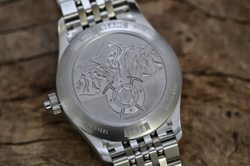 前面已经提到,这款表的表背为密底设计,因为里面搭载的并不是极具观赏价值的美耐华机芯,而是基于Sellita SW510打磨而成的自动上链计时机芯。它的摆频为28800 vph,可提供48小时的动力储备,并已通过了严苛的万宝龙500小时测试。