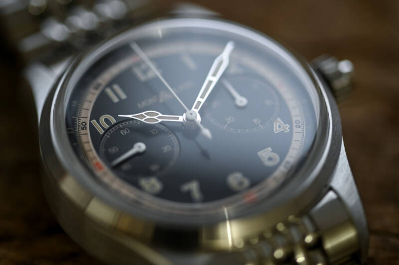 为了迎合现代市场需求,这款表那由精钢材质打造的表壳拥有着在如今的我们看来非常标准的42mm x 14.7mm的尺寸规格。其表壳周身采用缎面拉丝工艺进行了处理,底盖为密底设计,可提供100米的防水能力,本质上来看,这就是一款散发着浓烈复古气息的运动表。接合式的米珠精钢链带同样展现出了一种属于经典的魅力,不过你在上世纪30年代的飞行员计时码表身上可看不到这种链带设计…一样的,这也是一种让步,为了满足现代消费者对于佩戴舒适感的高要求,它的做工非常的精致,抛光的"米粒儿"和两侧的拉丝链节形成了鲜明的对比,极大地拉升了整款表的质感。