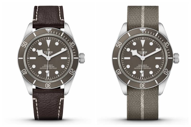 全新的帝舵碧湾1958型925腕表ref.79010SG同样也有两条表带样式可选,一种是深棕色粒纹表带,另一种是呼应表盘的灰褐色织纹表带,二者的表扣均为925银质针扣,它们的价格均为32300元人民币。