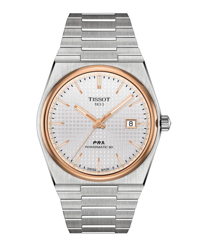 1978年,TISSOT天梭表推出品牌首款配备了"一体式精钢表链"(融表链、表耳、表壳于一体)的腕表,并为其搭配了隽永的酒桶型表壳。因其强大的功能性设计,该系列被命名为"PRX"--"P"代表"精准(Precision)","R"代表"坚固(Robustness)","X"则为罗马数字"10",意指该腕表防水性能可抵御相当于10巴(100米)的压力。