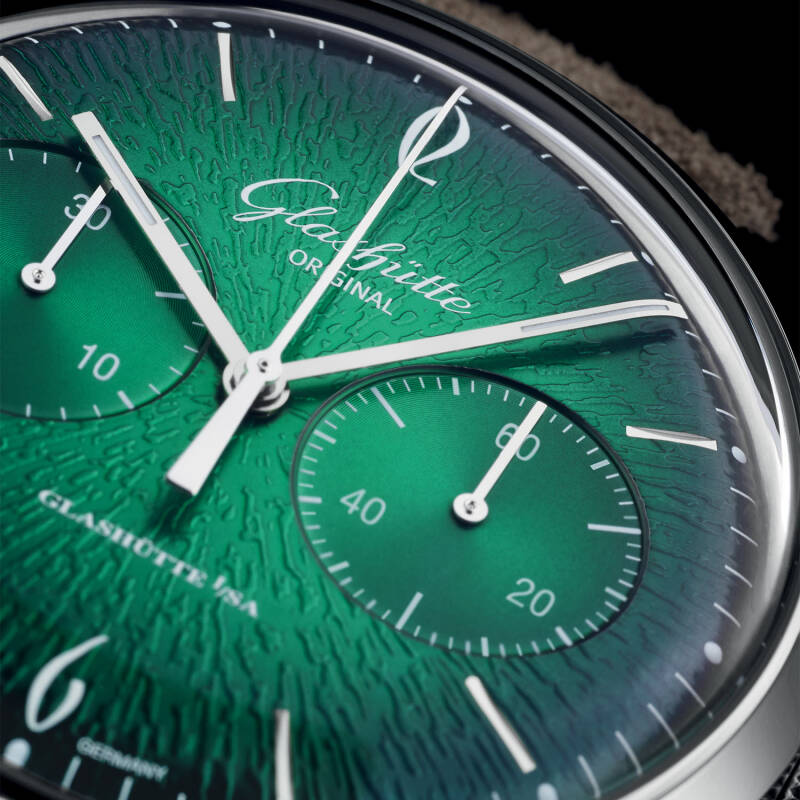 这款全新发布的计时腕表由我们经验丰富的制表师在德国格拉苏蒂(Glashütte)制作,亦如量身剪裁的套服一样精细考究,注重细节。42毫米圆形精钢表壳将目光引向手工精饰的复古表盘,从表盘中央到边缘,葱郁的绿色从鲜亮逐渐加深--丰富的渐变效果别具魅力。