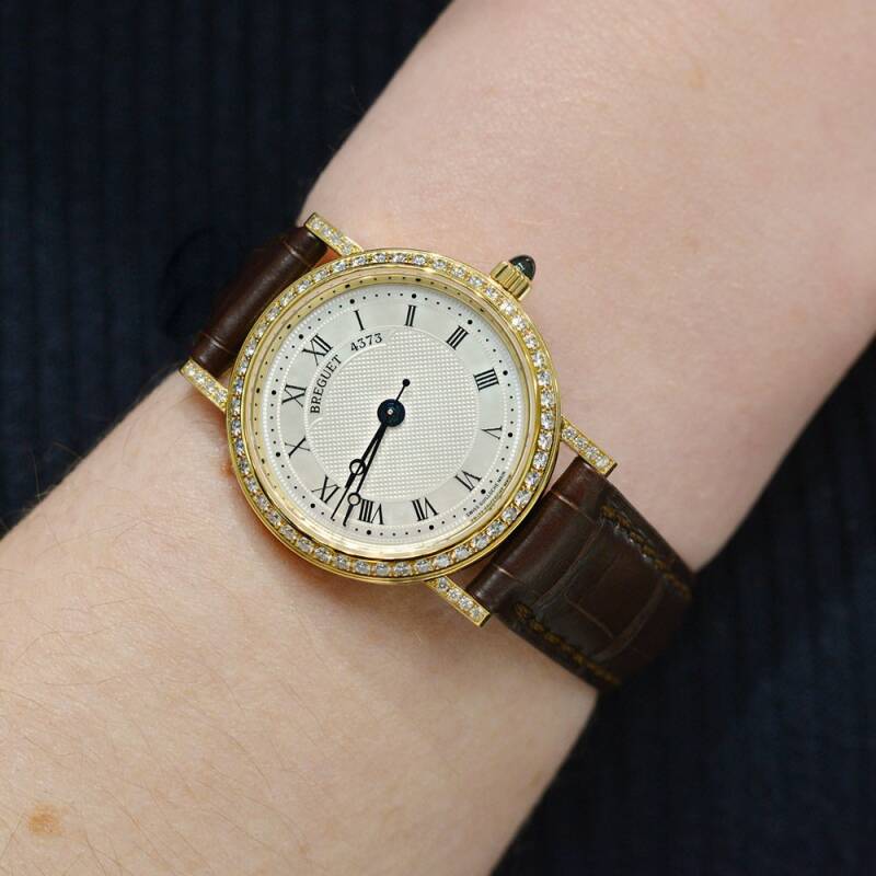 这是一枚宝玑经典系列8068BA/52/964/DD00腕表,这枚腕表搭载自动机械机芯,表壳为18k黄金材质,表圈镶嵌,鳄鱼皮表带,表径30毫米,防水30米,参考价格153100元(以实际价格为准)。