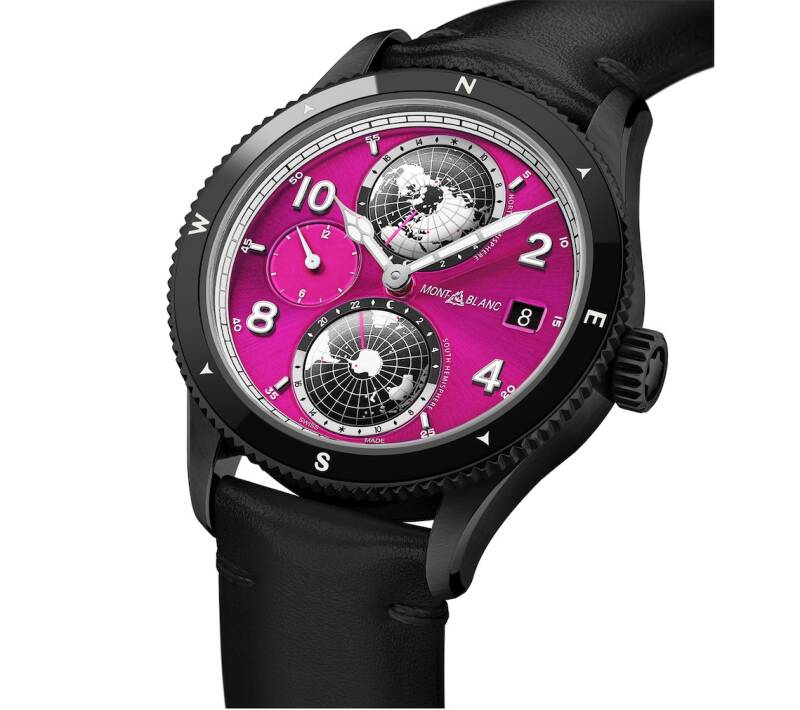 以迷人的紫粉底色,搭配深邃的黑色外观,万宝龙特别呈现此款独特的1858系列南北半球世界时腕表 粉色表盘特别版(孤品),参与"粉色表盘"慈善项目的同时也希望能赋予其未来表主自豪感与使命感,更期冀以此提升大众对于乳腺癌防治领域的认知。