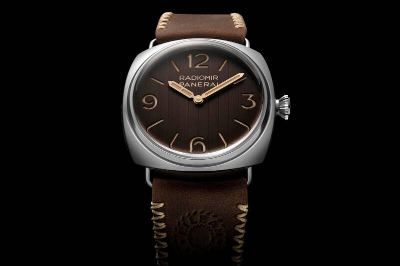 PAM01243的精钢表壳特别採用雾面和氧化处理达到仿旧效果,为的是展现Eilean帆船的历史岁月感,它的大尺寸枕型表壳、焊接线型表耳这些特徵都是来自早期的Radiomir手表,而在表壳左侧,我们可以看到与Eilean帆船船身相同的龙纹徽章以及"EILEAN"字样。而在手表的面盘上,首先映入眼帘的是让人联想起帆船甲板的垂直线条装饰,如同表壳,这些条纹装饰也特别採用旧化处理,让它的棕色调看起来更有久经时间焠链的感觉。至于手表的三明治面盘结构下方以及指针则是涂上色Super-LumiNovaTM夜光涂层,它们在黑暗环境中会发出绿色的夜光效果,佩戴者因而能够清楚阅读时间。