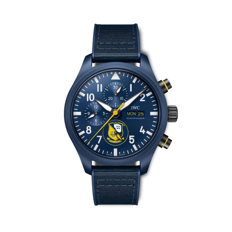 飞行员计时腕表"蓝天使"特别版(型号:IW389109)是IWC万国表与美国海军陆战队合作诞生的第三款腕表。该款计时腕表的灵感源自品牌与美国彭萨科拉(Pensacola)"蓝天使"中队成员共同研制的专业军用表,腕表采用蓝色陶瓷表壳,明亮的蓝色由氧化锆与其他金属氧化物混合而成。同样,计时按钮和表冠也采用由IWC万国表研制的Ceratanium®瓷化钛金属材质。表盘6点钟位置印有美国海军"金翼"(Wings of Gold)图案的标志性"蓝天使"徽章;独具特色的文字镌刻于钛金属表底。另有计时秒针、小秒针和3点钟位置的星期和日期显示为腕表增添黄色点缀,腕表搭配内衬织物的蓝色橡胶表带。