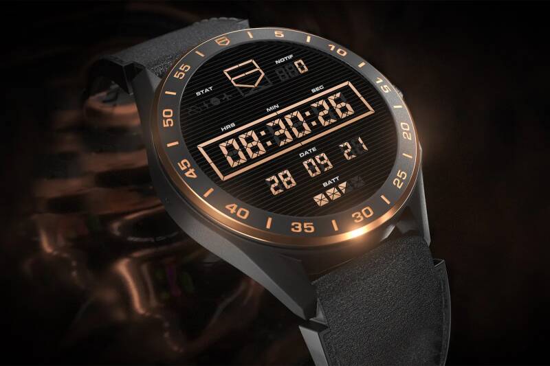 泰格豪雅Connected Bright Black特别版智能腕表的数位表面也经过一番升级,延续外观细腻的奢华质感,同时为使用体验带来更多变化。首先是全新独家设计的Eclipse(日蚀)表面,可用于Connected系列所有智能腕表,但特别版腕表将独家搭载金色版本,与美丽出众的表壳设计相互辉映。