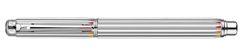 凯兰帝经典款书写工具与马利龙飞返计时码表(Manero Flyback)的传统造型相得益彰;镀铑和镀银的笔身装饰有玑镂刻花表冠造型,饰有手工上漆的彩色三角形图标与腕表的表盘完美搭配。笔夹上刻有一条细细的红线,让人联想到腕表的指针;造型采用精致漆面石墨灰六边形。凯兰帝经典圆珠笔巧妙融合了多种珍贵材料,通过品牌秉承至今的传统玑镂刻花和上漆技术,更显精美。这款卓越的书写工具采用流线型笔身,易于握持且书写舒适,洋溢隽永优雅的气息。
