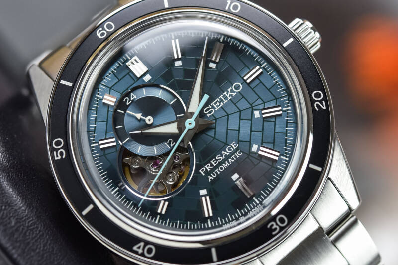 就像它的那些非限量版同胞一样,这款Presage SSA445腕表也使用的是琢面镶刻抛光时标,而与之相称的抛光指针上则涂覆了满满的夜光材质。表盘的9点和10点位处各放置了一面子表盘,但前者使用了掏空设计,揭示出了机芯的摆轮模块,并被后者24小时刻度盘遮盖住了一部分,营造出了一种有趣的堆叠之感。