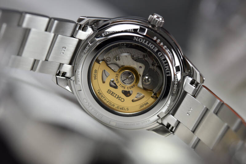 该表款内部搭载着的是Cal.4R39型自动机芯,其通过透底表背可见。该机芯使用了24颗宝石轴承,摆频为21600 vph,可提供41小时的动力储备。虽然它并不是一枚能够轻易便给人留下印象的机芯,但至少它在一定程度上展现出了精工的制表实力。