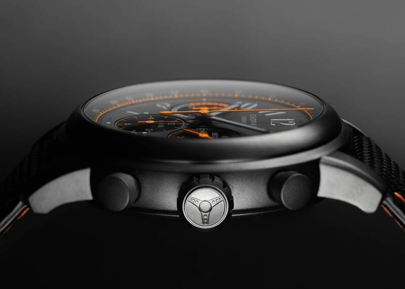 Mille Miglia Bamford特别版腕表源自这两位绅士之间一场惺惺相惜的对话,采用黑色、深灰色和火焰橙的优雅配色。直径42毫米的表壳由经过微珠打磨类钻碳(DLC)处理的精钢制成。此现代创新材料呈现古董车上常见的深灰色,还具备出色的防刮性能:这对需要经受赛车考验的运动腕表而言是一项重要优势。腕表侧面设有镌刻方向盘的表冠和两个活塞造型的按钮,令人联想到该系列的灵感来源。表耳短小精悍,搭配以橙色缝线点缀、橙色小牛皮为衬里的灯芯绒效果黑色橡胶表带,确保紧密贴合手腕。