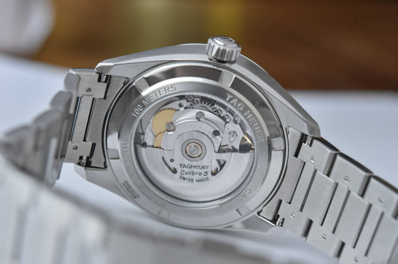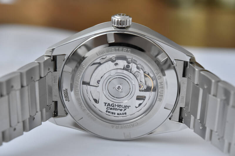 该表款内部同样搭载的是Cal.5型自动机芯,但要多了一颗轴承用于星期盘。至于其它规格则保持不变,通过透底表背便可对之进行观察。
