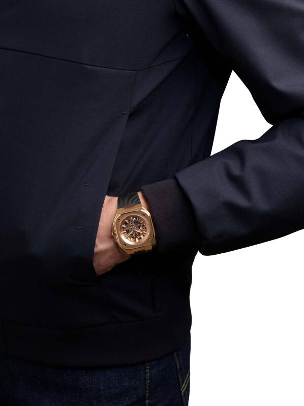 BR05 SKELETON镂空腕表限量99只,全玫瑰金型号用上155克黄金制作,为一体成型的表身加添华贵气质。