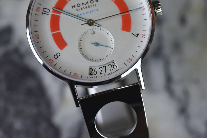 设计师Werner Aisslinger将NOMOS的Autobahn(高速公路)腕表经时速表与其对机械表的热爱与旅行的概念串连在一起。Autobahn Director's Cut A3的设计灵感撷取于1980年代的仪表板--「置于白色表盘上的橘红色亮环凸显出此腕表的运动感。」即使它的颜色如此抢眼,仍然能够保留出简约风格空间--从浅蓝色neomatik字体上可以辨识出新世代NOMOS机芯在腕表怀中运转着,而指针也同样披上了这美丽颜色。