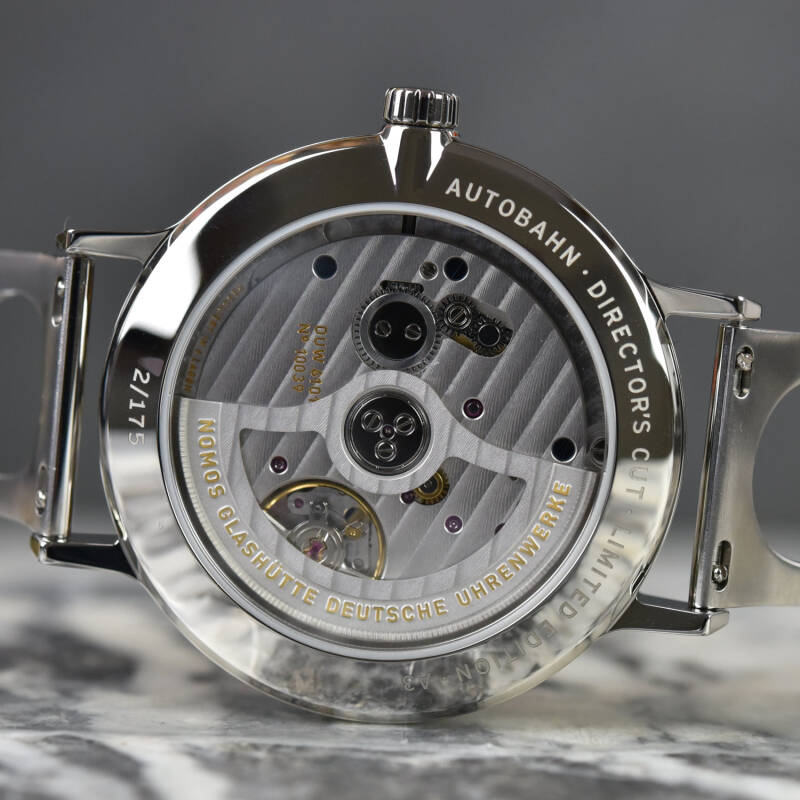 Autobahn Director's Cut限量版腕表搭载了Nomos自制的DUW 6101自动上链机芯,此机芯直径大达15½法分(35.2毫米)。它是第一款附有日期功能的neomatik机芯,日期显示特别清晰可辨,且能维持格外纤细的外型,厚度仅3.6毫米。DUW 6101配备NOMOS自制的擒纵系统,确保了机芯的高精准度。此一专利擒纵系统采用蓝色合金游丝,配以格拉苏蒂腕表的几种典型制表特征-如四分之三夹板,日辉纹,回火蓝钢螺丝等。所有这一切都突出了工程的最高标准的制表工艺。
