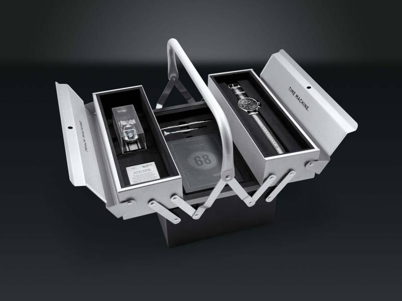 IWC万国表飞行员计时腕表"IWC x Hot Wheels™ Racing Works"特别版以及风火轮梅赛德斯-奔驰300SL"Racing Works"模型均带有数字68,以此呼应IWC万国表和风火轮的成立年份,分别为1868年和1968年。此外,定制包装让该套装更加珍稀:计时腕表和车模共同置于一只银、黑双色的金属工具箱内。箱子内还同时装有腕表说明书、项目介绍册以及标有专属套装编号的限量牌。