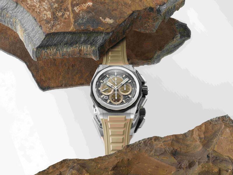 透过DEFY EXTREME Desert腕表的开心表盘,可以一览位于表盘下方的EI Primero型机芯的内部运行,彩色蓝宝石水晶玻璃表镜令计时盘和动力储存显示呈现出温暖的米棕色调,与米色荧 光时标和指针,以及相衬色调的镶贴计时盘相互呼应。这款概念腕表搭配一条经久耐用的黑色Velcro魔术贴表带和一条米色橡胶表带,可藉助表壳背面的表带快速更换系统轻松与钛金属表链 互换。