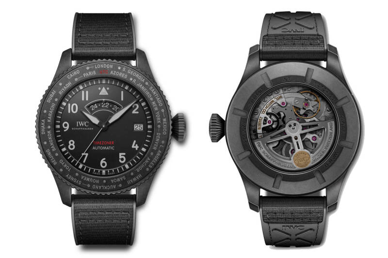 另外一款飞行员系列TOP GUN海军空战部队瓷化钛金属世界时区腕表(Ref.IW395505)搭载的82760自动上链机芯具备Timezoner®世界时区,拥有专利快调机制,当转动印有世界城市的表圈时,垂直的轮系会连动机芯,同步移动表盘时针与扇形视窗内的24小时制第二地时间。此外,佩戴者必需平均施压两侧才能转动表圈,避免误触,可谓相当贴心的设计。