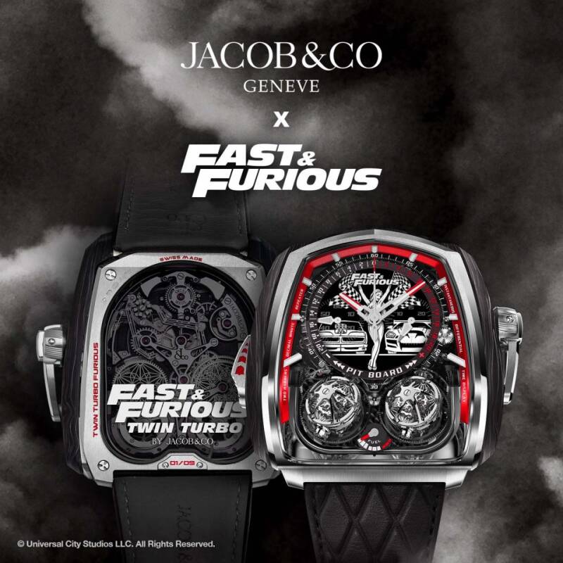 2021年6月,Jacob&Co.杰克宝与环球影业联名推出《速度与激情》电影合作版Fast & Furious Twin Turbo速度与激情双陀飞轮腕表。该款腕表专为速度而设计。在正面和中央的大块蓝宝石水晶玻璃表镜之上是一个举着格子旗的赛车宝贝(*电影中的固定配置,起源于街头赛车),两辆赛车在她身后蓄势待发,呼应着上方的《速度与激情》标志。
