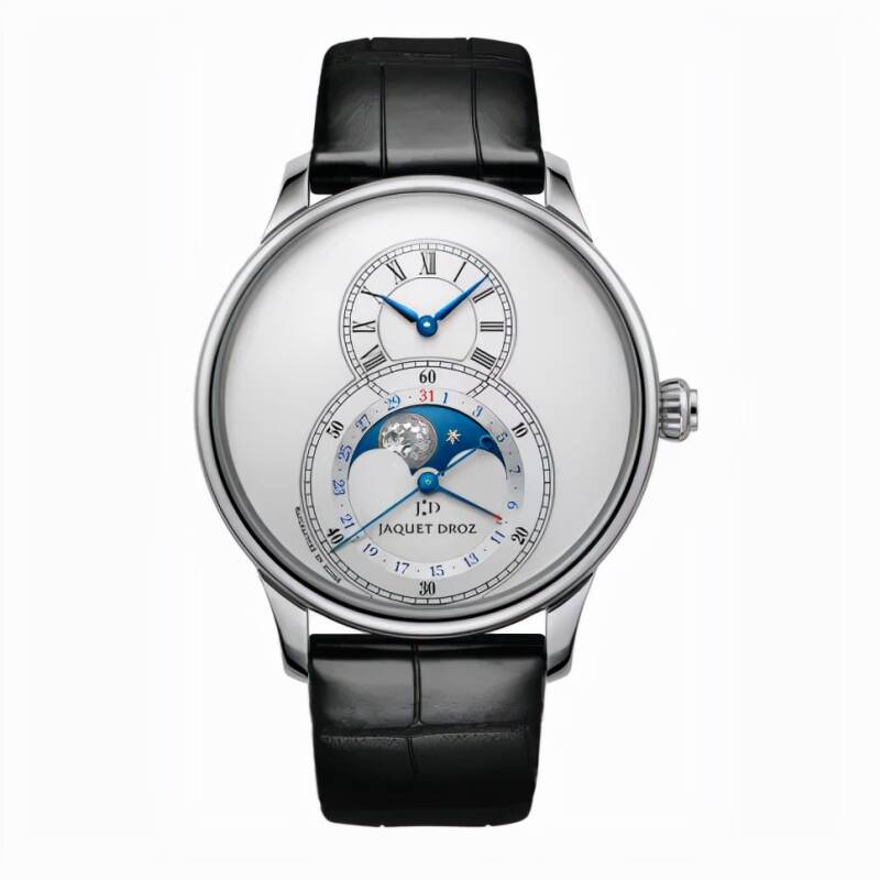 这是一只雅克德罗大秒针系列J007530240腕表,这枚腕表搭载自动机械机芯,表壳为精钢材质,镀银蛋白石表盘,蓝色月相刻度盘,搭配18K白金星星和22K白金月亮镶饰,手工卷边鳄鱼皮表带,具有日期显示和月相功能,表径43毫米,防水30米,参考价格126500元(以实际价格为准)。