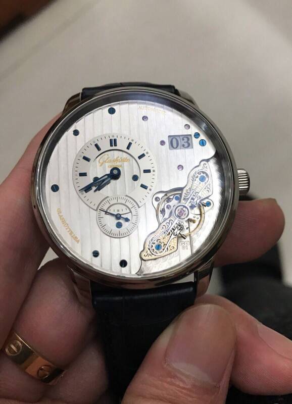 这是一只格拉苏蒂原创偏心系列1-91-02-02-02-30腕表,这枚腕表搭载自动机械机芯,表壳为精钢材质,表盘上半镂空部分精美呈现格拉苏蒂原创品牌特色双鹅颈微调装置,路易斯安那鳄鱼皮表带,具有日期显示功能,表径42毫米,防水50米,参考价格103000元(以实际价格为准)。