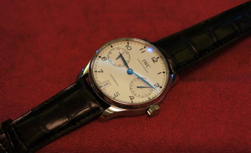 这是一只IWC万国表葡萄牙系列IW500705腕表(新款葡7),这枚腕表搭载自动机械机芯,表壳为精钢材质,镀银表盘上有蓝色指针和嵌入式时标,鳄鱼皮表带,具有日期显示和动力储备显示功能,表径42.3毫米,防水30米,参考价格96500元(以实际价格为准)。