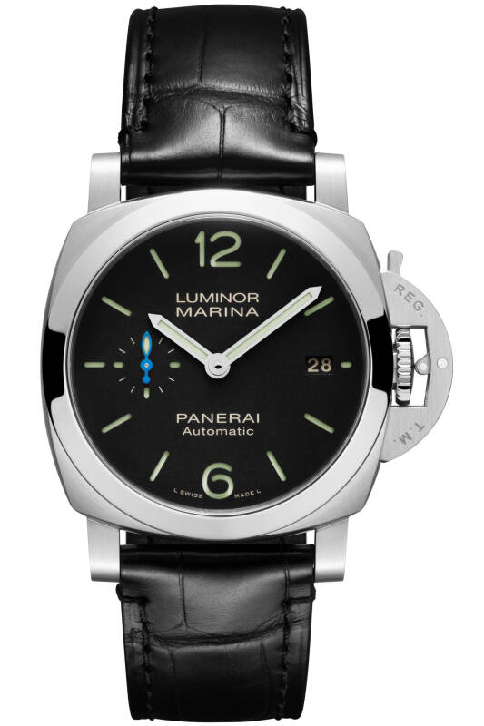 Luminor Marina Quaranta庐米诺系列腕表采用精钢表壳,搭配三款不同的表盘设计, 均呈现出独树一帜的美学风格。表盘上9点钟位置设小秒盘,3点钟位置设日期显示。