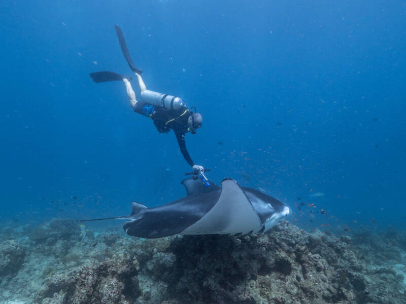 在考察期间,魔鬼鱼基金会团队进行了 400多个小时的水下研究,他们运用先进的超声波和"立体视频摄影测量"设备,识别和研究魔鬼鱼聚集的清洁站,并开展生态保护项目,收集有关魔鬼鱼大小、年龄、成熟度和繁殖力的数据。从翼梢到翼梢,马尔代夫珊瑚礁魔鬼鱼可以长达4.5米。其他魔鬼鱼种类,例如海洋魔鬼鱼,可以长达7米多。该基金会已经确定了11个不同的魔鬼鱼种类。
