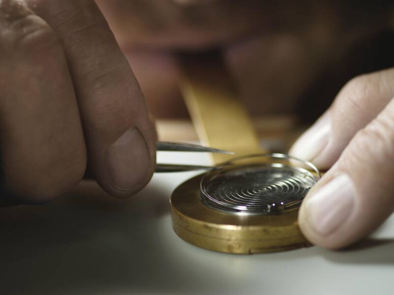在正式开始前,需要在预先设定好的表壳中层部位进行尝试性的珠宝镶嵌,以确认整个项目的可 行性,并确定接下来的工序步骤。手工雕刻师先用划线器细致地勾勒出装饰图案的轮廓,然后以 浅浮雕手法,小心翼翼地用刻刀凿出内凹的背景空间,以凸显葡萄藤叶图案。在此过程中要凿出 113个凹槽,并在凹槽周边留出一圈外框,用于镶嵌和固定五种不同尺寸的红宝石,构成硕果累 累的葡萄图案。接下来,由珠宝镶嵌师结合爪镶和包镶工艺,在表壳上精心镶嵌弧面切割红宝 石,每颗宝石至少有三个固定点。
