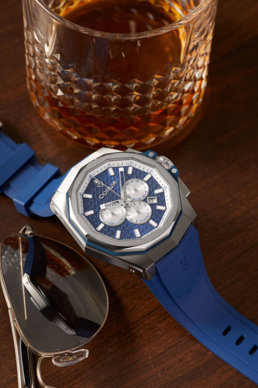 全新上市的Admiral 45限量计时码表,设计延续自2013年首度推出的海军上将AC-One 45计时码表的特点。首先显而易见的是换用棒状时标,而特色的海事旗语时标则以图像线稿方式呈现,安置于倾斜的12边形内圈上相应位置。跳脱彩色时标带来的活泼,转而呈现低调内敛的现代风味。在功能意义上,这样的设计也能更有余裕、清楚地在时标上加入夜光涂料,使腕表在光线昏暗的情况下也能清楚辨识,在维持系列特色的前提下,也解决海事旗语时标虽然抢眼,但不容易涂上夜光涂料的遗憾。