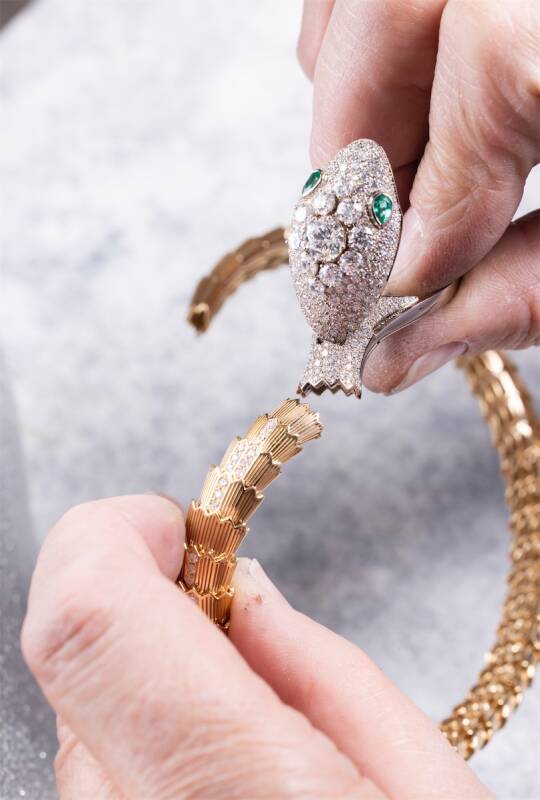 全新Serpenti Misteriosi腕表严格遵循宝格丽的设计精神,采用灵动而不失华丽的造型设计,着重体现优雅的装饰艺术与精湛的珠宝制作工艺。作为金饰工艺的典范之作,全新Serpenti Misteriosi腕表的许多组成部件在进行装饰、宝石镶嵌以及组装之前都是单独成型的。此外,表链与蛇首均由珍贵金属打造而成,同时采用特殊结构设计,以便确保佩戴的舒适性与轻便度。