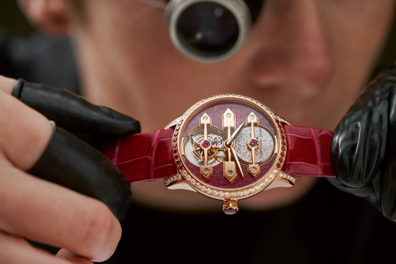 表壳采用18K玫瑰金材质,直径为38毫米。表圈和上表耳的表面装饰56颗明亮型切割钻石,重量约1.25克拉。此外,表圈还饰有18颗明亮型切割红宝石,重量约0.36克拉,紧邻红色鳄鱼皮表带。表带配备玫瑰金折叠表扣,表扣镶嵌18颗明亮型切割钻石,重量约0.20克拉。表冠饰有一颗经过抛光的凸圆形红宝石之心。丰富多姿的珍贵宝石不仅彼此相得益彰,更与这款典范级的"高级制表"杰作生出琴瑟和鸣之意,演绎恰到好处、浑然天成的腕表美学。